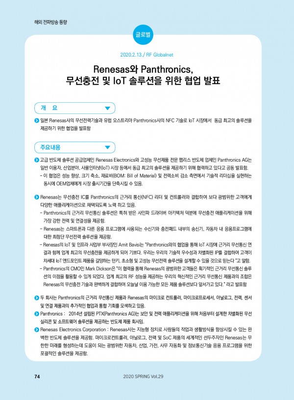 Renesas와 Panthronics, 무선충전 및 IoT 솔루션을 위한 협업 발표 페이지 정보 등록일 : 20-07-03 조회 : 3,644 본문 Renesas와 Panthronics, 무선충전 및 IoT 솔루션을 위한 협업 발표 목록 이전글imec, 세계최초 전자 알약용 밀리미터 크기 무선 송수신기 발표 20.07.03 다음글Nokia, 소프트뱅크와 5G 커넥티드 카 테스트 완료 20.07.03