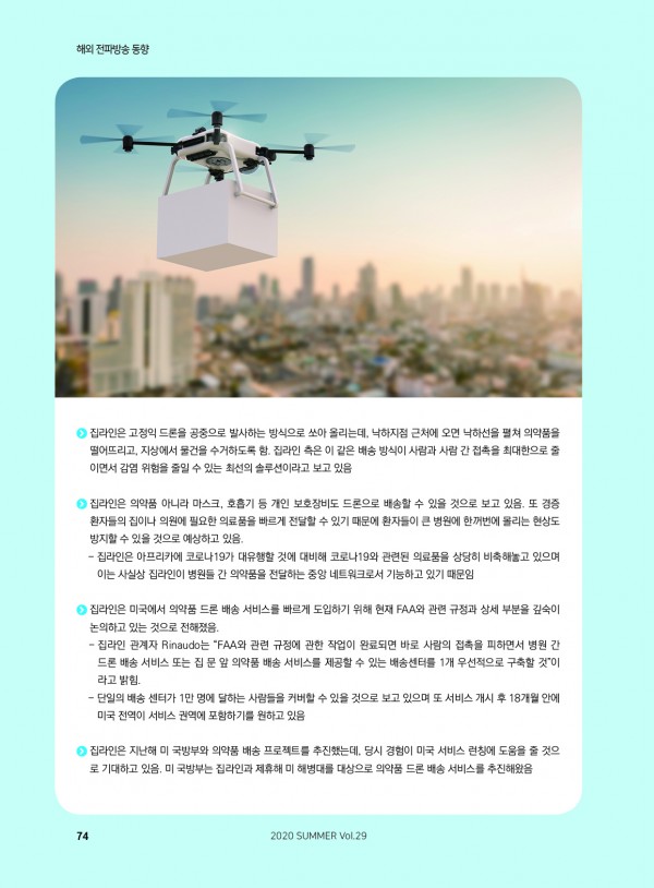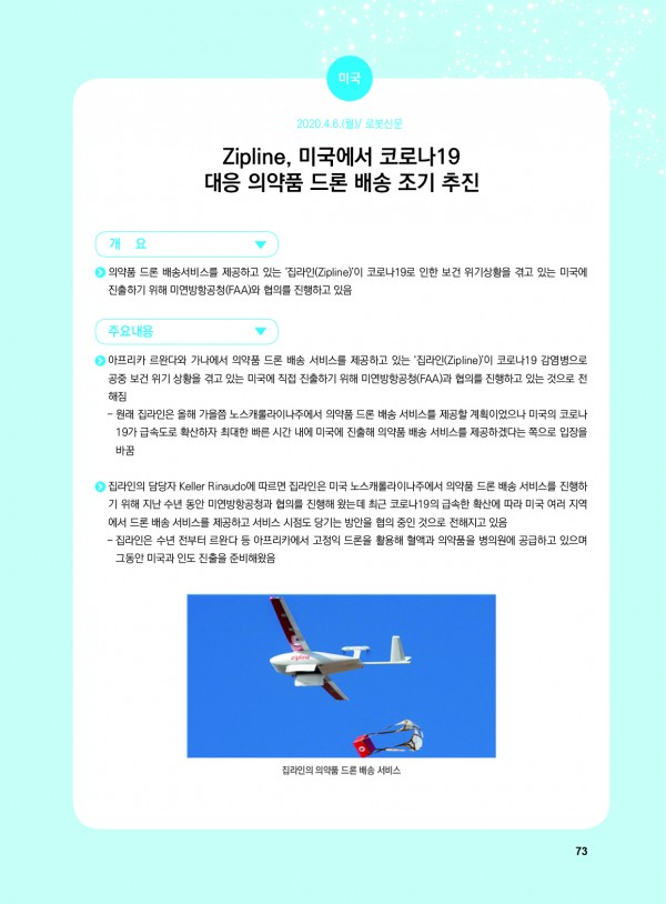 Zipline, 미국에서 코로나19 대응 의약품 드론 배송 조기 추진 페이지 정보 등록일 : 20-07-03 조회 : 3,858 본문 Zipline, 미국에서 코로나19 대응 의약품 드론 배송 조기 추진 목록 이전글인체를 전기 도체로 이용한 새로운 무선전력전송 방법 20.07.03 다음글FCC, 6GHz 대역 비면허 사용 규칙 초안 발표 20.07.03