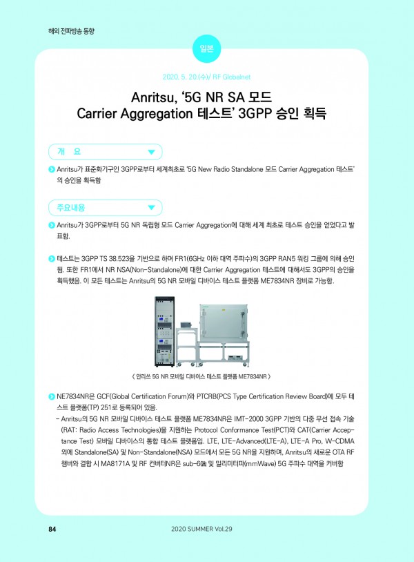 Anritsu, '5G NR SA 모드 Carrier Aggregation 테스트' 3GPP 승인 획득 페이지 정보 등록일 : 20-07-03 조회 : 3,903 본문 Anritsu, '5G NR SA 모드 Carrier Aggregation 테스트' 3GPP 승인 획득 목록 이전글Qualcomm, 6GHz 대역 Wi-Fi 6E 칩셋 솔루션 발표 20.07.03 다음글가변적 무선 충전 시스템으로 주행 EV에 전원 공급 20.07.03